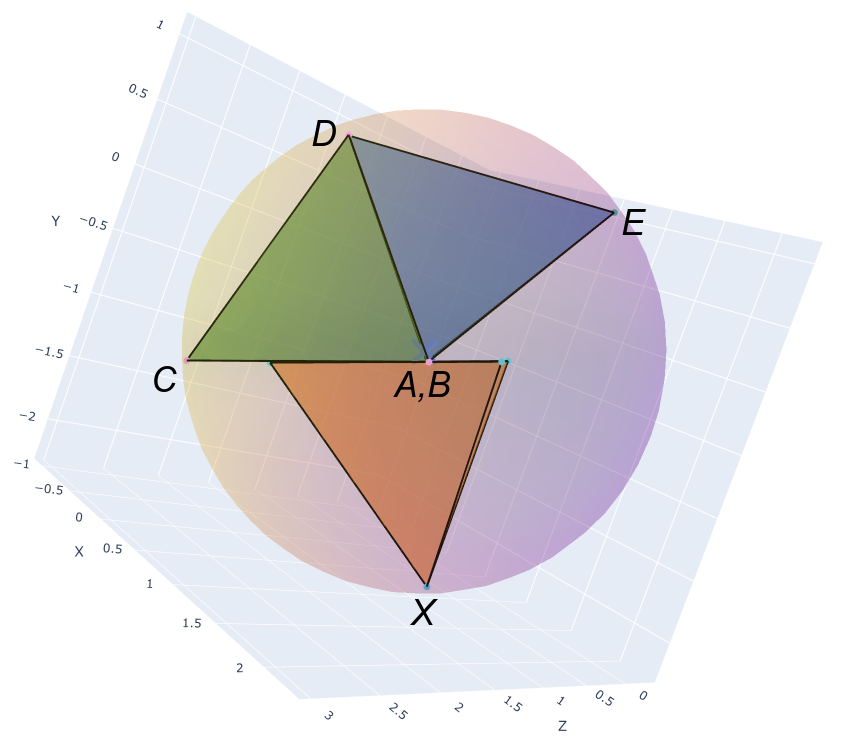 我们建立一个三维的直角坐标系,而这张图表示的是在XY平面上的投影。可以看到图中过$C,E,X$这三点的圆即为最小外接球的大圆,我们需要找到让外接圆最小的$X$点。为方便起见,记棱长$a=\sqrt[3]{6\sqrt{2}}$,则$A,B$两点的坐标为$(0,0,\pm a/2)$。由于$ABC$是正三角形,$C$点的坐标是$(-\frac{\sqrt{3}}{2} a,0,0)$。正三角形的高是$\frac{\sqrt{6}}{3} a$,而$D$在底面上的投影是中心,在中线的$2/3$处,因此$D(-\frac{\sqrt 3}{6} a,\frac{\sqrt 6}{3} a, 0)$。点$E$的坐标也是确定的,但其实无需算出。点$X$的$y$坐标是$-\frac{\sqrt 6}{3} a$,而显然$z$坐标取0是最优的,唯一的未知值是其$x$坐标。这就是一个标准的初中平面几何问题: