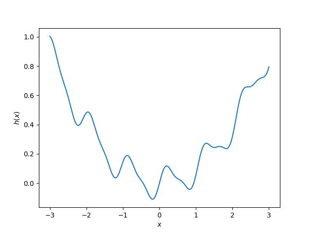 A needle of length 1 rests on the surface defined by the height function $h(x)=0.1x^2+0.1\sin(6x)+0.03\sin(12x)$. What is the lowest possible height of the center of the needle?