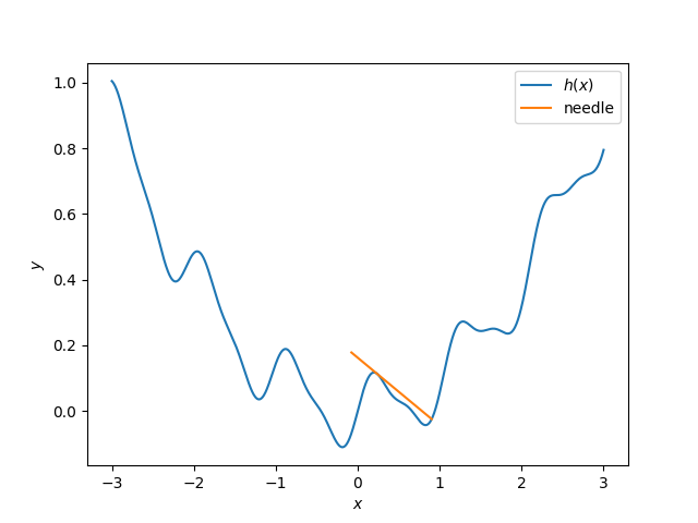 由此可见这根针下方与曲线相切,而右端顶在曲线上。使用这个近似解计算可得切点的$x$坐标约为$x_0=0.23684$,而右端和曲线交点的$x$坐标约为$r_0=0.90241$。虽然整体来看这一优化问题的目标函数相当崎岖,但在最优解的附近它当然是凸的。因此我们可以直接在$x_0$的附近三分法搜索切点,然后使用$r_0$为初值牛顿迭代计算切线和曲线的交点,从而确定整个线段的位置,并计算中点的高度。C++代码,答案为